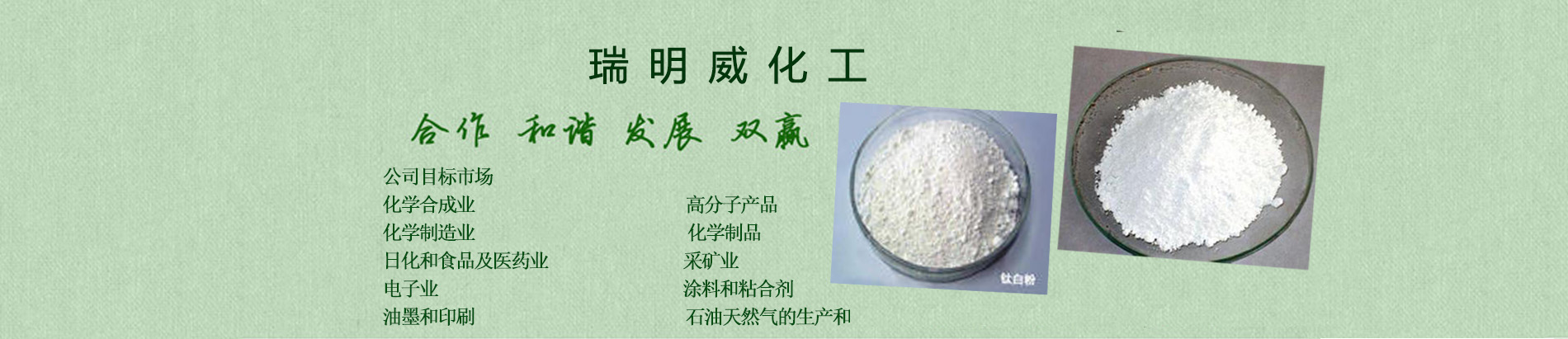 天津市瑞明威化工有限公司公司概況公司本著“興業(yè)、興人、興社會”的三興企業(yè)文化在業(yè)內有著崇高的聲譽產品覆蓋面大,銷售輻射華東、華南、華北數百種產品,多種銷售模式可供選擇華東、華北、沿海、沿江長期包租有儲罐和倉庫提供個性化的完全服務,解決用戶在化學品使用中的一切煩惱供應鏈外包 個性化定裝與標簽 來料加工業(yè)務 分包裝 化工超市 買方庫存管理公司目標市場化學合成業(yè) 高分子產品化學制造業(yè) 化學制品日化和食品及藥業(yè) 采礦業(yè)電子業(yè) 涂料和粘合劑油墨和印刷 石油天然的生產和提煉